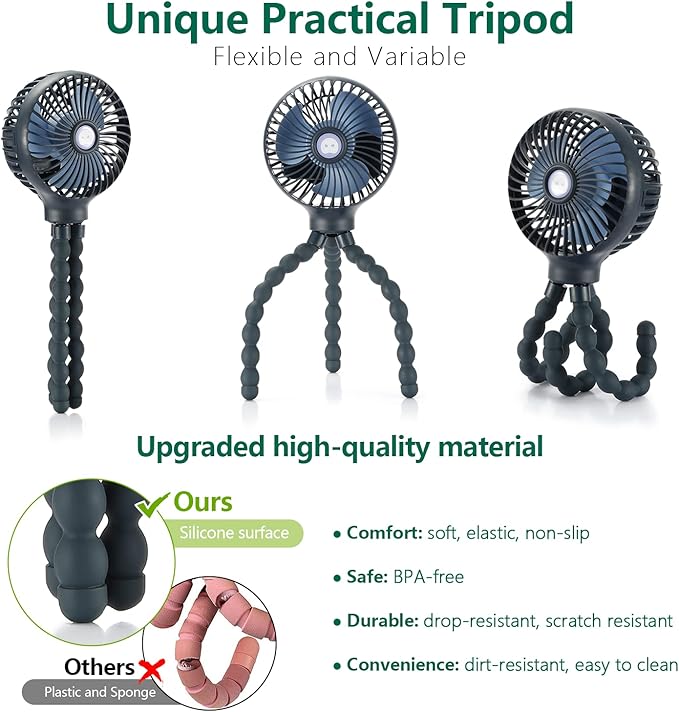 • 【Upgraded Flexible Unbreakable Tripod】snawowo baby stroller fan has an upgraded tripod which is made of high quality bendable metal and food grade silicone surface instead of the old plastic and sponge surface. so you don't have to worry about the baby eating it by mistake. The tripod is waterproof, not easy to get dirty and broken, easy to clean, and more anti-wear.
