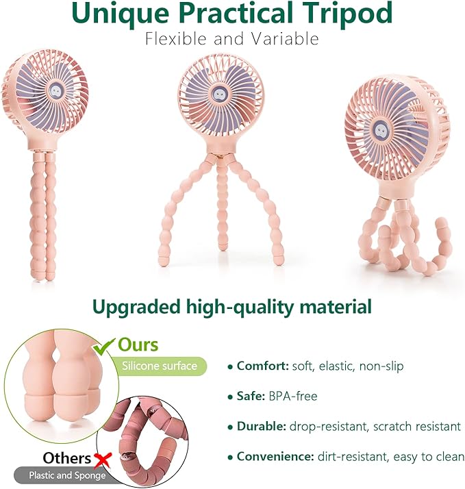 • 【Upgraded Flexible Unbreakable Tripod】snawowo baby stroller fan has an upgraded tripod which is made of high quality bendable metal and food grade silicone surface instead of the old plastic and sponge surface. so you don't have to worry about the baby eating it by mistake. The tripod is waterproof, not easy to get dirty and broken, easy to clean, and more anti-wear.