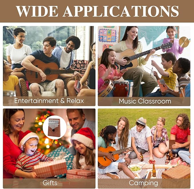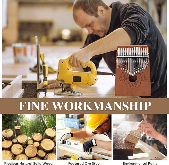 • Beautiful Soud: 17 key kalimba has a warm and rich tone like mahogany, with a sweet and pleasant sound. Finger piano kalimba body is made of solid wood and box structure, with strong resonance and a crisper, louder and longer sound. The kalimba 17 keys tuned in C are staggered for flexibility and wear resistance, and produce a pleasant resonant sound when played gently, ideal for acoustic playing