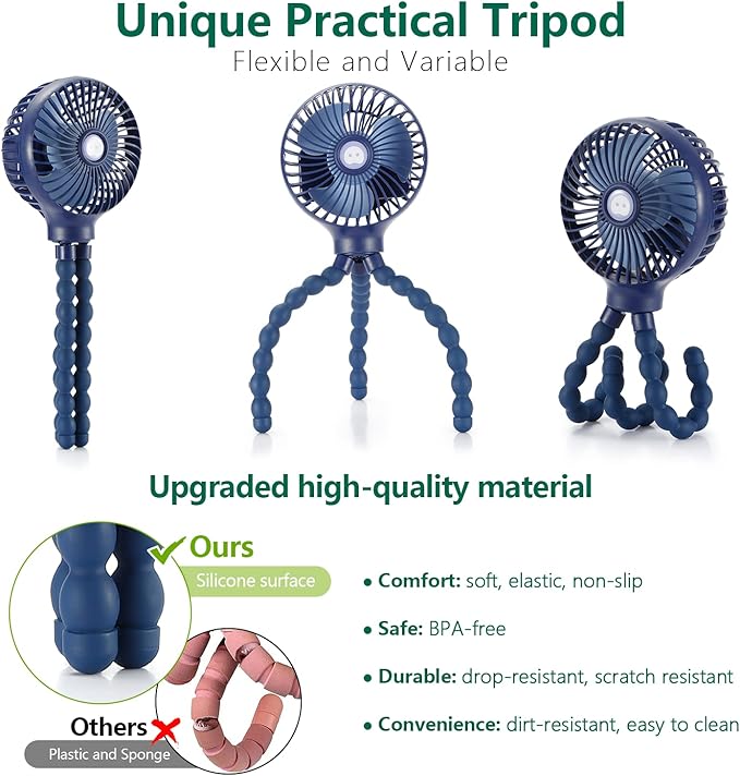 • 【Upgraded Flexible Unbreakable Tripod】snawowo baby stroller fan has an upgraded tripod which is made of high quality bendable metal and food grade silicone surface instead of the old plastic and sponge surface. so you don't have to worry about the baby eating it by mistake. The tripod is waterproof, not easy to get dirty and broken, easy to clean, and more anti-wear.
