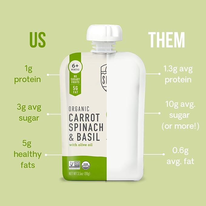 • ORGANIC CARROTS, SPINACH & BASIL: Contains 1 pouch of baby food puree made from organic carrots, spinach, and basil, plus healthy fats from olive oil.