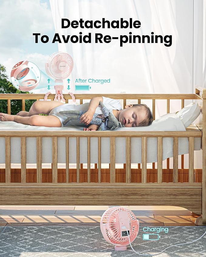 • Upgraded Flexible Durable Tripod: Shell made of food-grade silicone, safe for the baby; Optimized the tripod fixing method, which is more durable and not easy to fall off; You can remove the fan head to charge at will, no need to repeated fixation