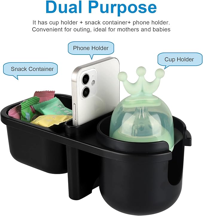 • The 3 in 1 multifunctional holder includes a snack catcher, drink holder and phone holder for snacks on the go. Ideal for mom and baby.