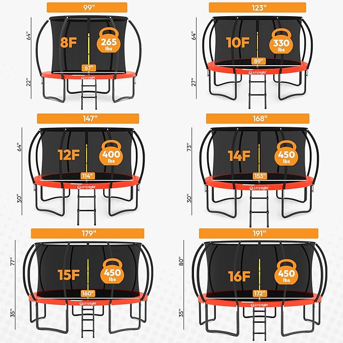 • SIZED FOR EVERY BACKYARD: Whether you have a cozy yard or wide-open space, we’ve got you covered. Available in 8 FT, 10 FT, 12 FT, and 14 FT trampoline sizes to fit your outdoor space perfectly. Jump into fun that fits just right.