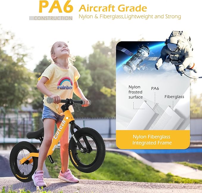 • INTEGRATED NYLON FRAME - Constructed of Aircraft Grade PA6 and fiberglass integrated molding, Frame constructed in one piece without any welding brings a smooth and beautiful appearance. The nylon frame is sturdy and lightweight., weights 6.4 lbs, the lightweight balance bike frame design makes the bike easier to control for kids.