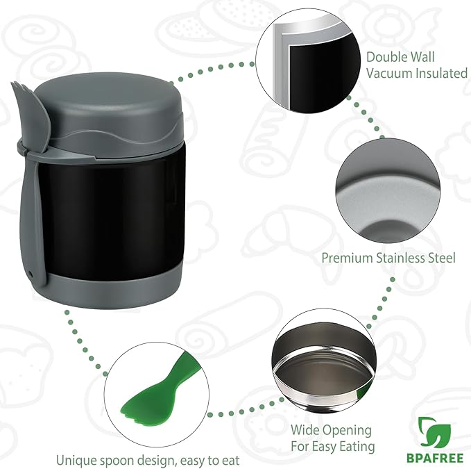 • Leak Proof Design: Feel confident that our leak-proof food jars will fit in your lunch bag without worrying about spilling messes. The insulated thermo food jar comes with a food-grade spoon for your child's convenience.