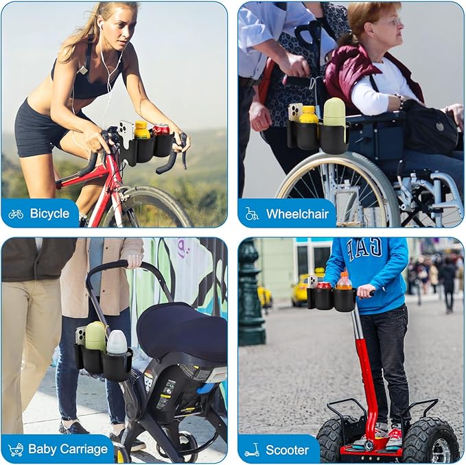 • Wide Compatibility: This universal cup holder with phone holder compatible with most baby strollers, walker, wheelchair, rollator, bike, scooter, boat handle bar, shopping cart, kayak, ATV, lawnmowers, motorcycle, treadmill, golf push cart and so on.