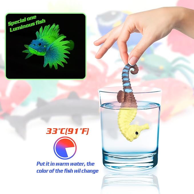 • Color Changing Toys: These sea creatures toys for kids magically change colors in warm water above 91.4 F(33 C). When placed at room temperature or refrigerated, fish toy returns to its original color.
