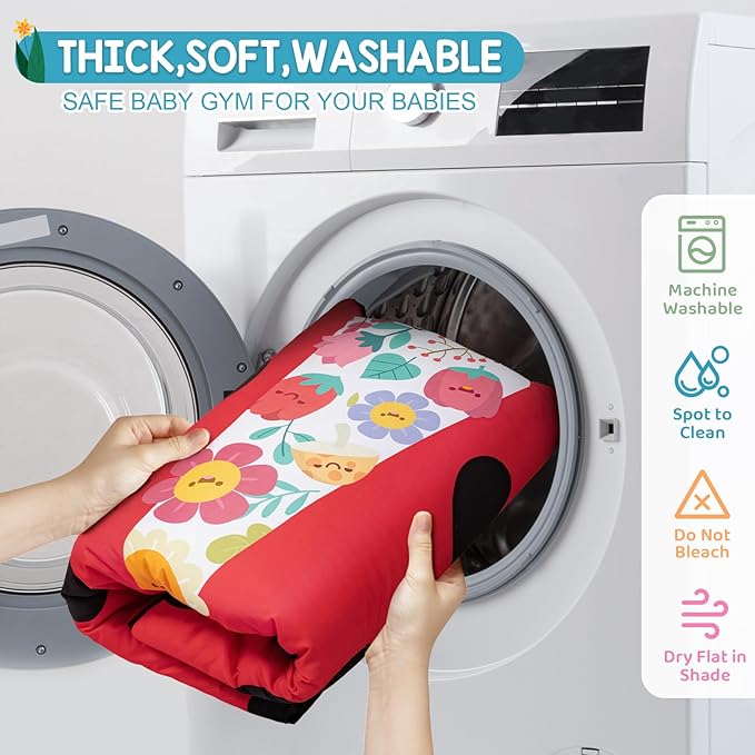 • Soft, Safe, and Washable - The baby gym play mat is made from high-quality fabrics, thick, delicate, and smooth touch, safe and comfortable for baby skins. Machine washable, easy to clean and keep hygienic. The tummy time activity mat can also be used directly on the floor, providing cushioning and protection for the baby. The balance of flatness and softness makes it more stable for babies to sit, stand and crawl.