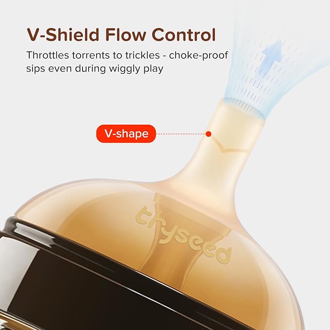 • V-VALVE DESIGN: Automatic opening, easy sip, effortless flow. Size varies with suction, self-adjustable flow, smooth sips, choke-free trips. No spray, no leak! Learning to drink should be fun, not messy. Spill-proof soft spout is gentle on teeth and gums.