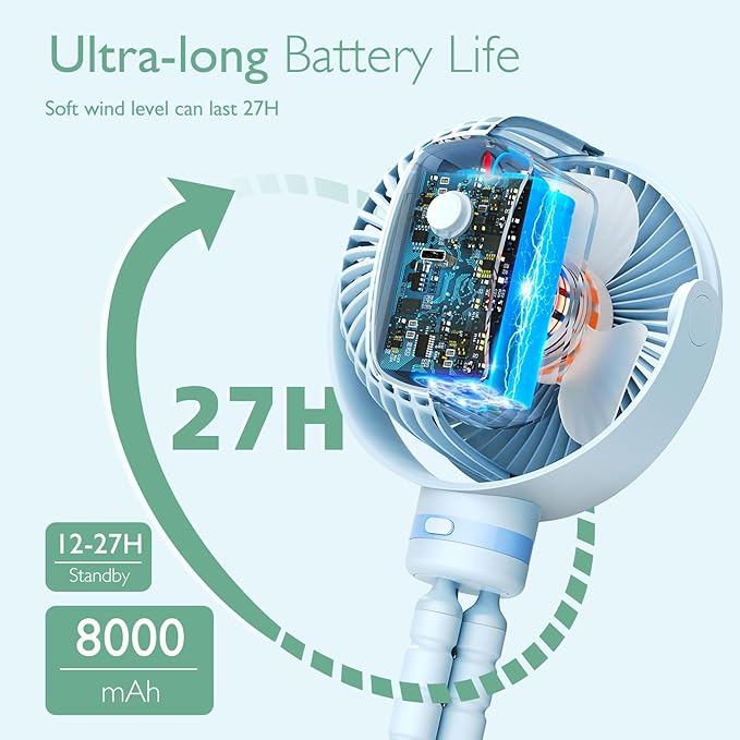 Momcozy Portable Stroller Fan, 8000mAh, 27H Ultra-long Battery Life, Detachable 4 Speed 360°Rotate, LED Night Light with 2 Modes, USB Rechargeable Handheld Cooling Fan for Travel, Car Seat, Bedroom
