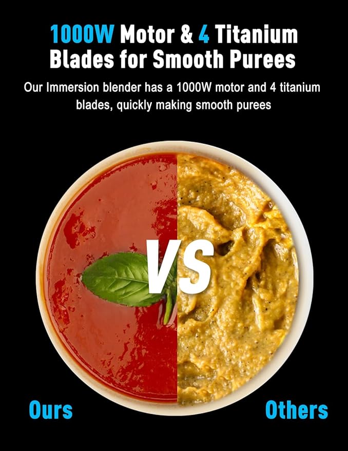• 【1000W High-Power Motor】Our 2025 Immersion Blender, powered by a 1000W pure copper brushless motor, effortlessly crushes even the toughest ingredients. Designed for power and durability, it ensures smooth, consistent results with every use.