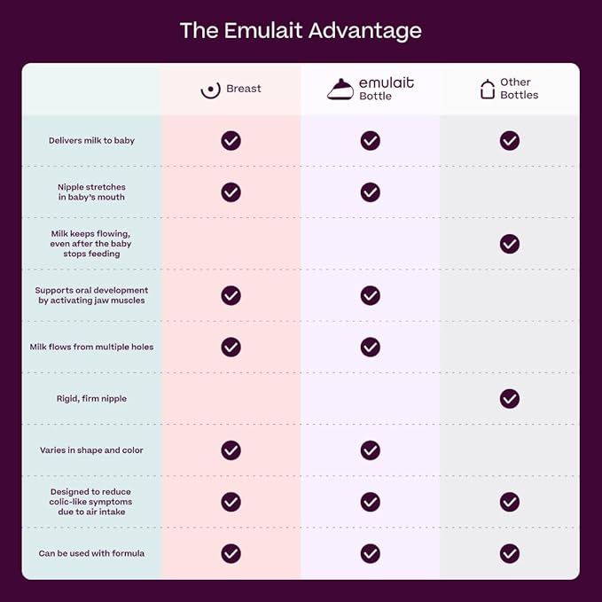• Nurturing Breast-to-Bottle Transition: Designed to minimize nipple confusion and encourage prolonged breastfeeding, Emulait bottles offer a harmonious blend of comfort and oral development benefits. Say goodbye to preference issues as our biomimetic system ensures smooth transitions.