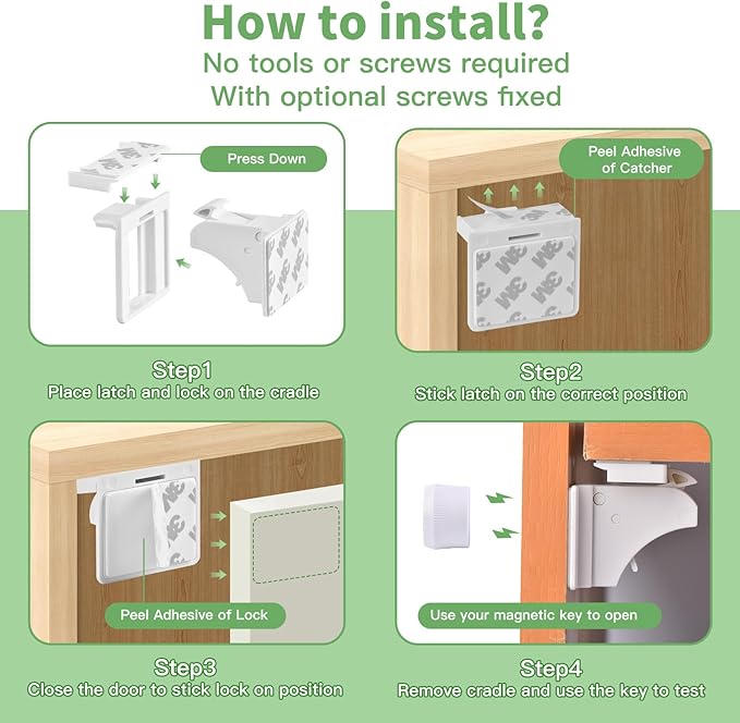 • [ 10 LOCKS + 2 KEYS ] Vkania magnetic cabinet locks are perfect for baby proofing cabinets and drawers. These child proof cabinet locks feature a strong magnetic design to keep curious toddlers and pets out. Easy to install with 3M adhesive—no tools, drilling, or holes required. Ideal for baby safety locks for cabinets in kitchens, bathrooms, and more.