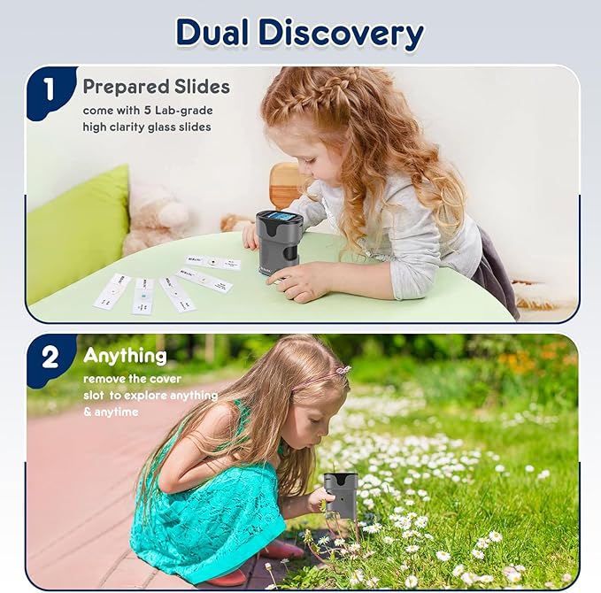 • Portable Pocket Microscope: This kids microscope weighs only 0.34lbs and 4*3*1.8 inch in size. it is small enough for your kids pocket or bags sacks, it come with a thickened neck strap to free your hands while running.