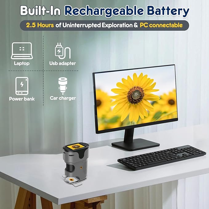 • Rechargeable: our digital microscope built-in with large capacity rechargeable battery. can be used continuously for 2.5 hours after fully charged, the charging cable included.