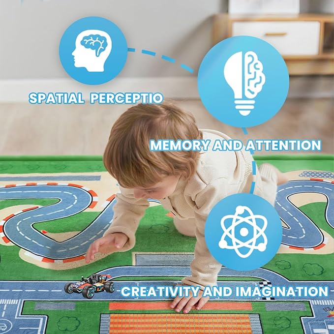• Fun Educational Race Track Design: This vibrant car race track rug stimulates imagination and learning. Perfect as a classroom rug or playroom rug, it helps develop spatial awareness and creativity in toddlers and young children