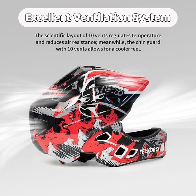 • FULL FACE PROTECTION SYSTEM: YEEKORO children's full face bike helmet is a unique blend of hard ABS shell and advanced EPS crash-proof material, with well-designed chin protection, which together builds a multiple defense system. Whether riding off-road or on the highway, your child will be provided with comprehensive safety protection, effectively resisting injuries caused by strong impacts and guarding every moment of adventure.