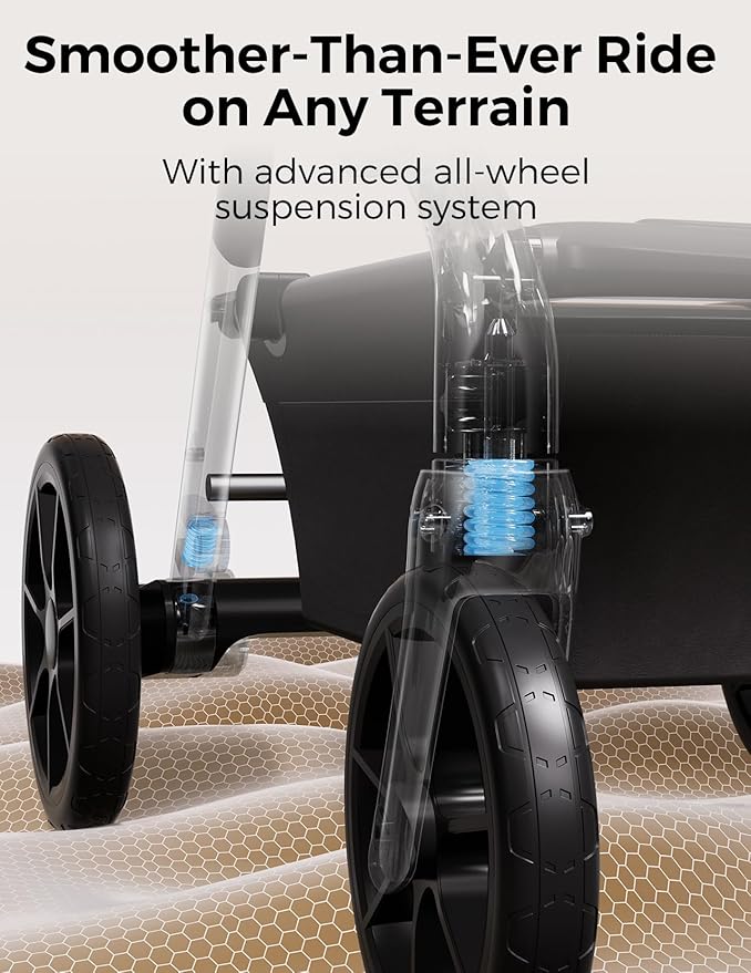 • Smooth and Comfy Strolling: No worries about waking baby on bumpy surfaces or over curbs thanks to the large 10-inch front swivel wheels, 12-inch rear wheels, and advanced suspension system with high-performance, shock-absorbing springs; adjustable handlebar with 5 height positions makes pushing comfortable for parents of different heights; innovative braking system protects shoes from scuffs and stains during operation