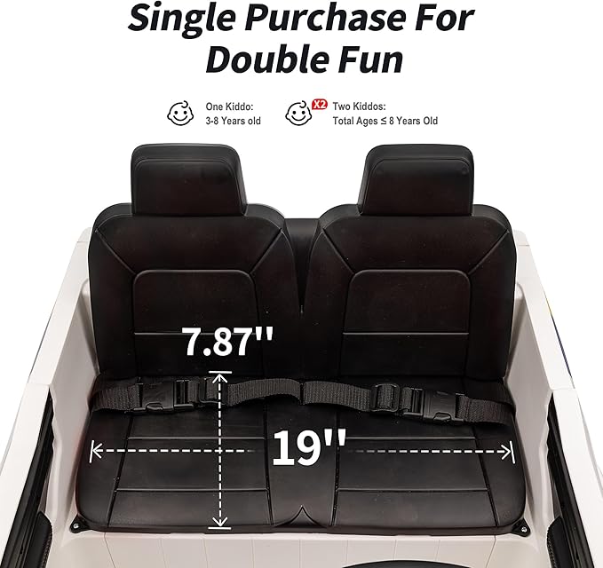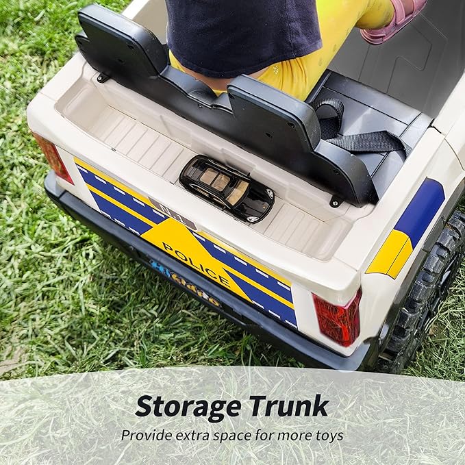 • 19" DUAL SEATER : This battery powered police kids car has ample seater, allowing two children to ride together comfortably under 110lbs. Adjustable seat belts and double-locking door design also ensure kid's safety.
