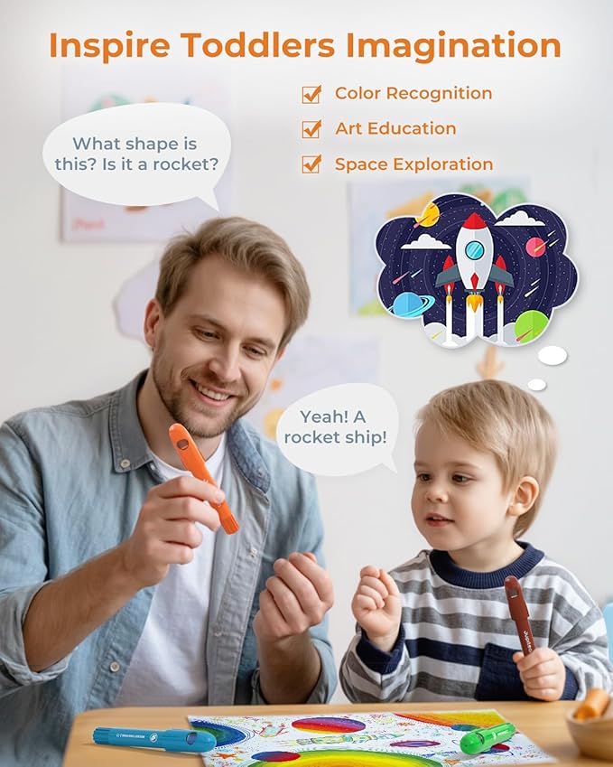 • Spark Little Imaginations with Rocket Crayons: The unique rocket-shaped design sparks children’s interest in space and science. It’s a fun way for parents and grandparents to start engaging, space-themed conversations while drawing together. Our twist crayons encourage early STEM curiosity and make learning more exciting through creative play