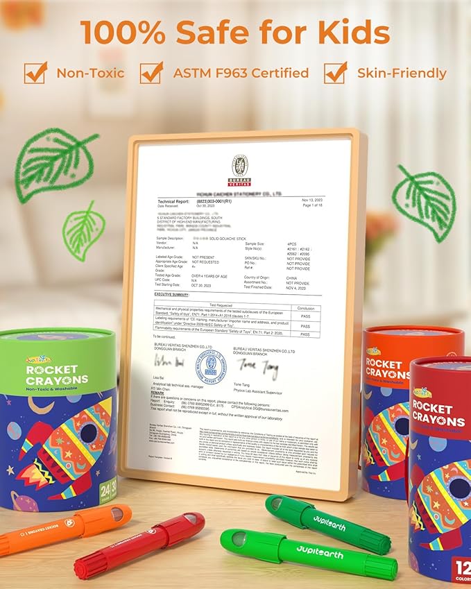• Non-Toxic & Easy to Clean: Our non toxic crayons are safe for toddlers 1-3, 2-4, 4-8 and certified to meet ASTM F963-16/17 and EN71-3 standards. Our washable crayons clean easily from skin, furniture, walls, and clothing, making creativity worry-free at home