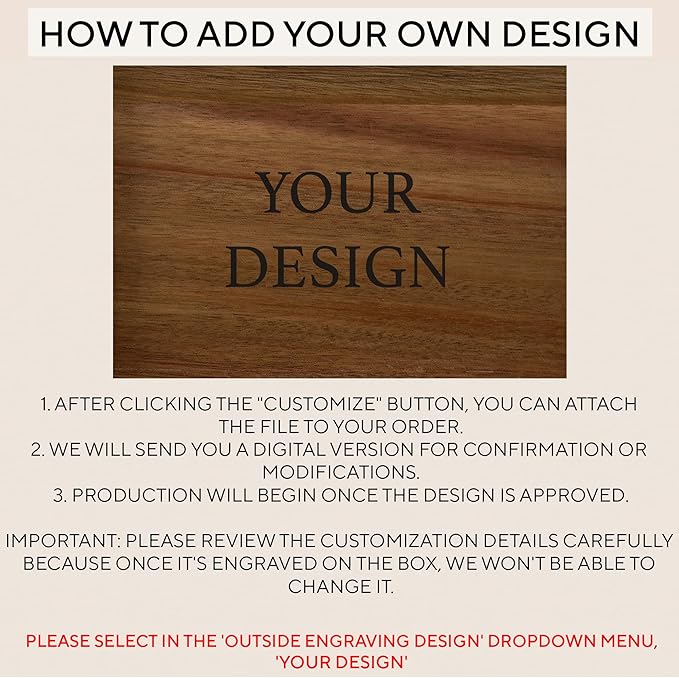 • Customizable: this acacia wood memento box can be engraved with various designs offered including the couple's names, dates or short phrase to make it unique. We’ll use the font style showcased in the photos. Additionally, it can be engraved inside(different font options), on the other lid's side, to create a surprise message for the recipient