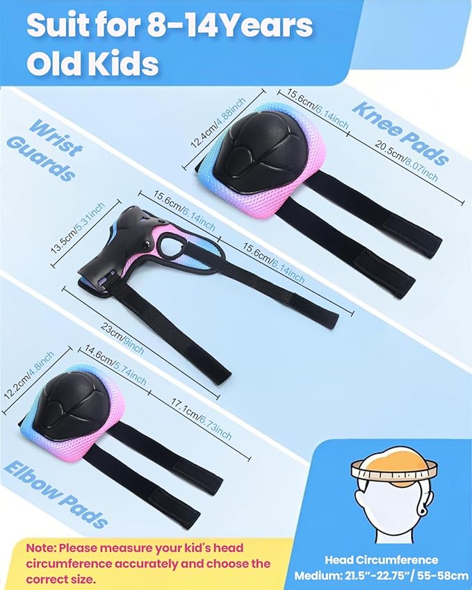 • 7PCS Kids Helmet and Protective Gear Set - Includes 1 adjustable helmet, 2 knee pads, 2 elbow pads, and 2 wrist guards—everything your child needs for safe riding. Built with a tough, scratch-resistant PP shell and cushioned interiors for long-lasting protection and comfort.
