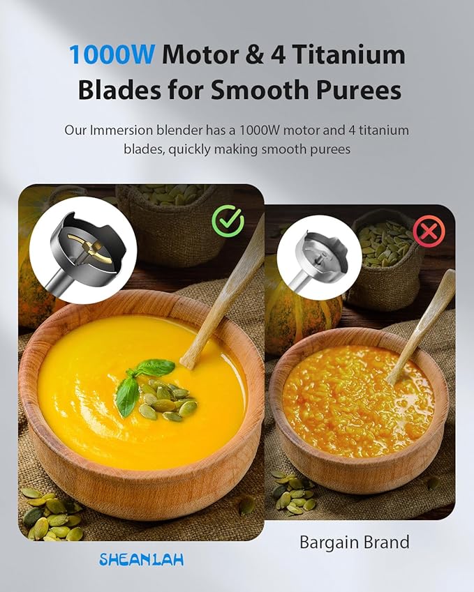• 【4-Blade Titanium Head】Our immersion blender features a 4-blade titanium head for superior performance. Compared to standard 2-blade designs, it blends more efficiently, This cutting-edge design not only improves blending efficiency but also extends the lifespan of the blades, making it a reliable choice for all your culinary needs.