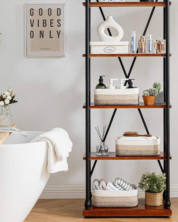 • [ Elegantly Designed to Match Any Décor ] Our small rope basket creates a minimalist appearance, and it adds a touch of warmth and texture to any room. The classic solid color design ensures seamless integration with your existing aesthetics, complementing any decoration. Perfect as decorative storage baskets for shelves, cabinets, and any open display space, making them a stylish and practical addition to any decor, enhancing the overall aesthetics of your room