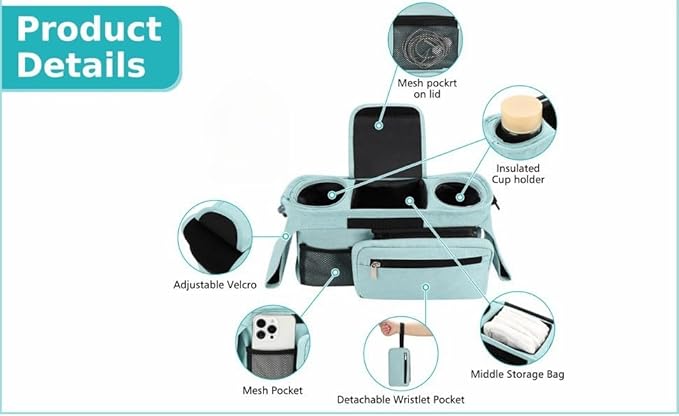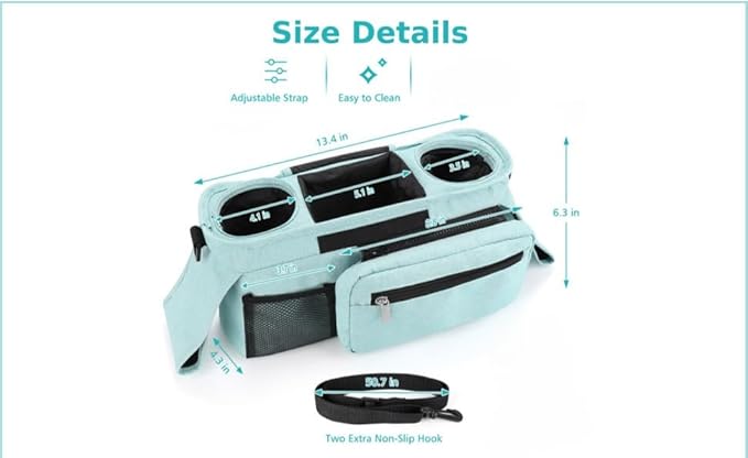 • ✅ DURABLE & WATER-RESISTANT – Made from premium, easy-to-clean fabric that resists spills and daily wear. A stylish stroller organizer designed by parents, for parents..