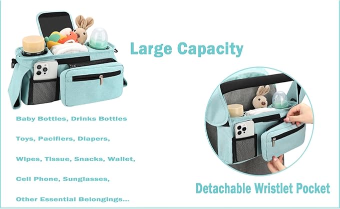 • ✅ BUILT-IN WIPES DISPENSER – Quick front-access wipes slot for messes, spills, or diaper changes. Perfect stroller caddy feature for busy parents.