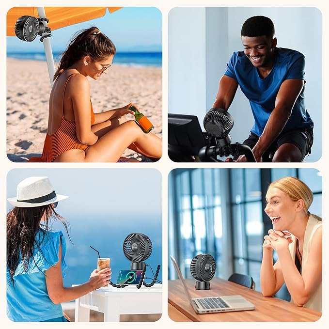 • 【Baby-Safe Design】The baby fan for stroller features <5mm finger-safe gaps in the fan cover, a food-grade silicone tripod that's safe for baby's touch, a removable front cover for easy cleaning, and upgraded circuit protection for safe use even while charging.