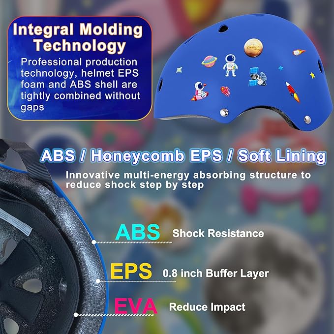 • 【Unique DIY Kids Helmet】 Toddler youth helmet included space themed stickers, your kids can enjoy and use their imagination to create their own customized bicycle helmet. With knee pads and elbow pads set, effectively protects your kids from injuries during multi-sports, not only protects the baby but also delights the mood. The designed bicycle helmet is a great gift for kids 8-14 years old. (One sticker picture will be given randomly)