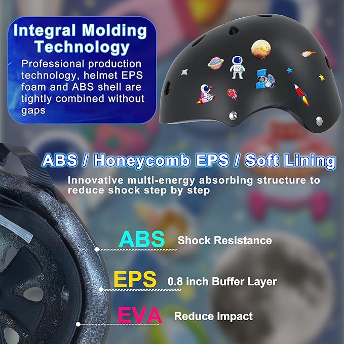 • 【Unique DIY Kids Helmet】 Toddler youth helmet included space themed stickers, your kids can enjoy and use their imagination to create their own customized bicycle helmet. With knee pads and elbow pads set, effectively protects your kids from injuries during multi-sports, not only protects the baby but also delights the mood. The designed bicycle helmet is a great gift for kids 8-14 years old. (One sticker picture will be given randomly)