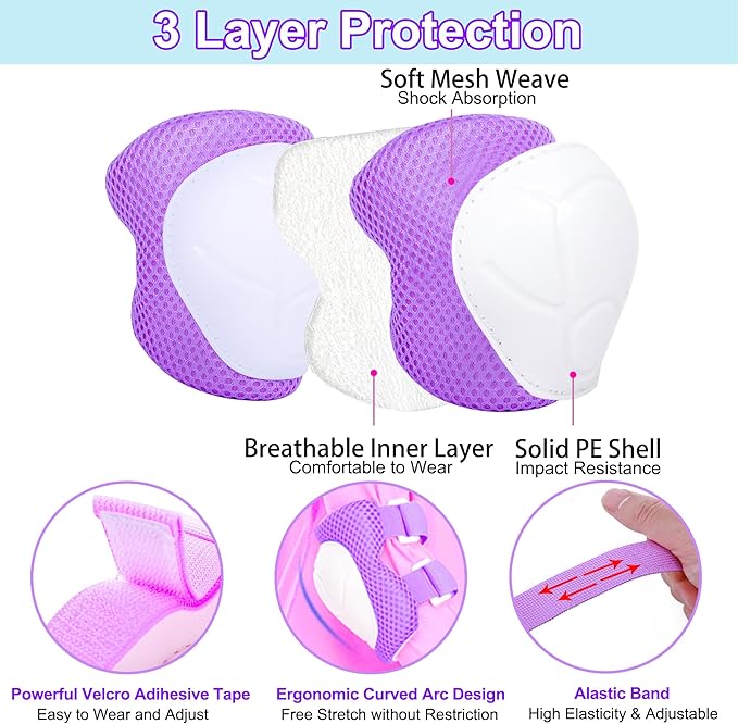 • 【Kids Knee Pads and Elbow Pads Set】 The kids bicycle helmet comes with 2 x Elbow Pads, 2 x Knee Pads, and 2 x Wrist Pads. Consist of an anti-scratch extra hard PVC shell for protection, and velcro adjustable straps ensure the protective gear will not shift. Protective gear pad set provides comprehensive safety protection for children.